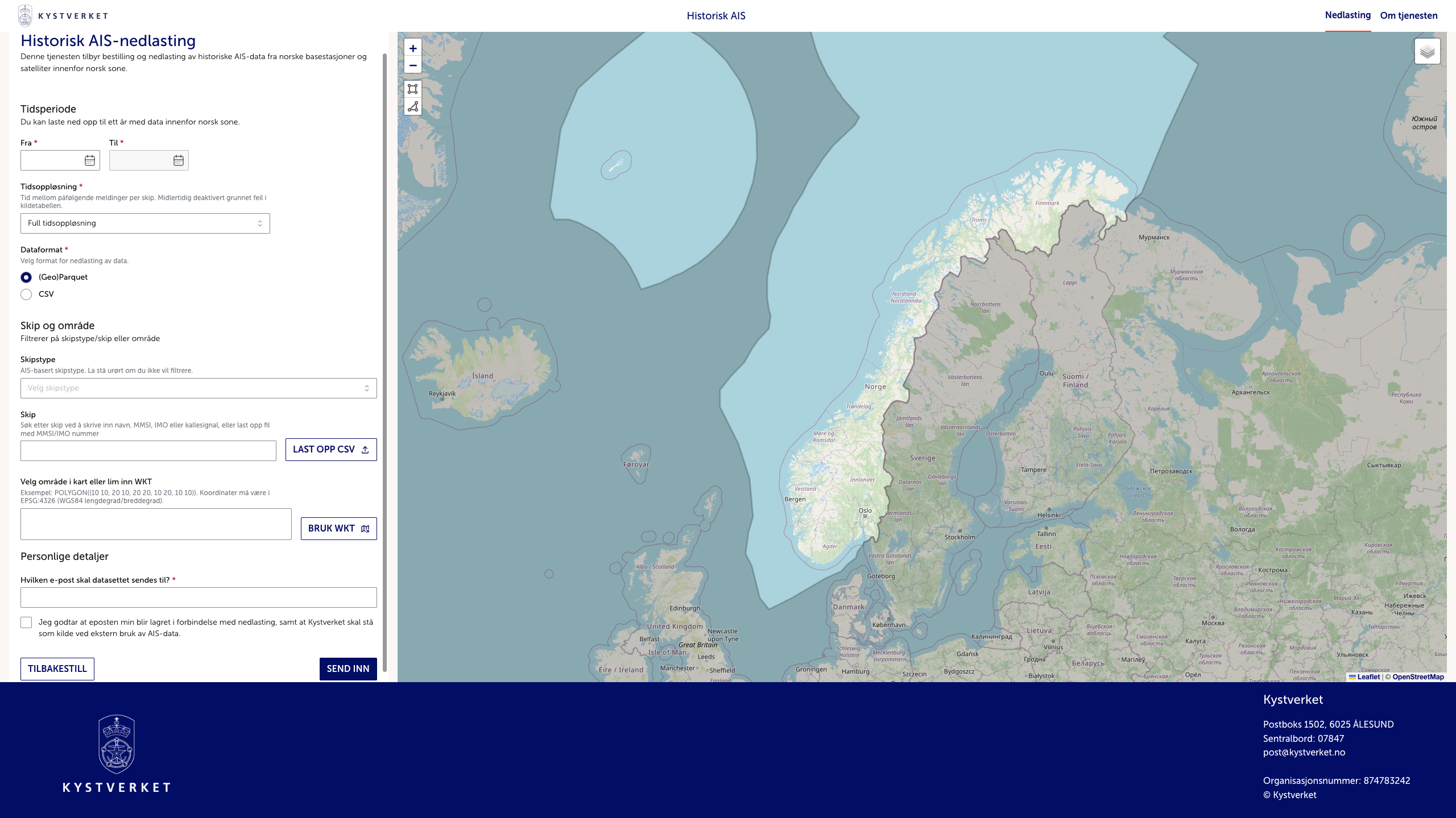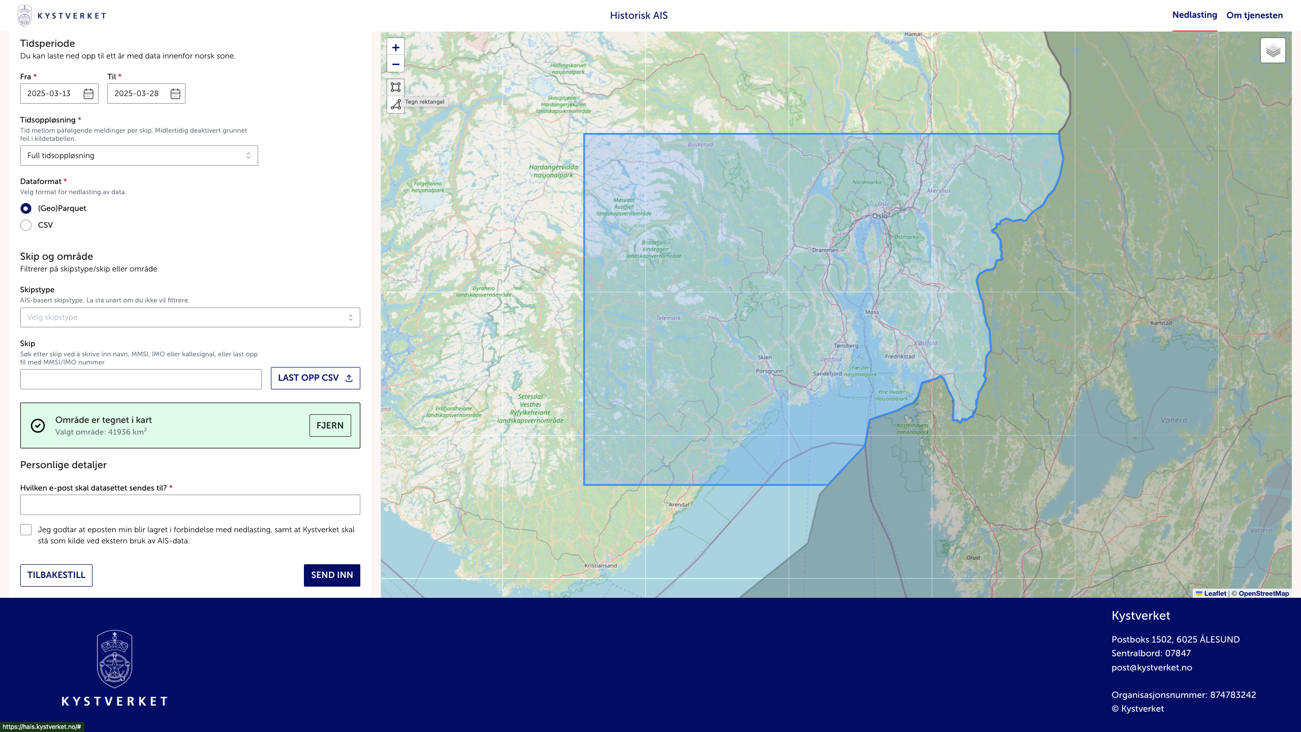NÃ¥r du er fornÞyd med sÞkeparametrene, trykker du Send inn. Systemet validerer sÞket basert pÃ¥ geografisk omrÃ¥de og tidsrom. Hvis du fÃ¥r feilmelding, har du trolig sÞkt for bredt â snevre inn sÞket i tid eller rom.