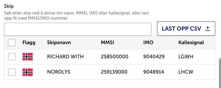 Hvis du kjenner navnet på fartÞyet, eller har MMSI, IMO eller kallesignal, kan du sÞke direkte. Skriver du inn Richard With, får du opp relevante treff. Du kan filtrere på flere fartÞy samtidig eller laste opp en CSV-liste.
