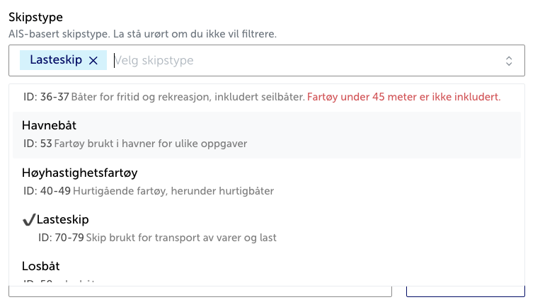 Hvis du kjenner skipstypen du vil filtrere på, men ikke fartÞyets navn, kan du bruke skipstype-feltet. Du kan filtrere på blant annet: