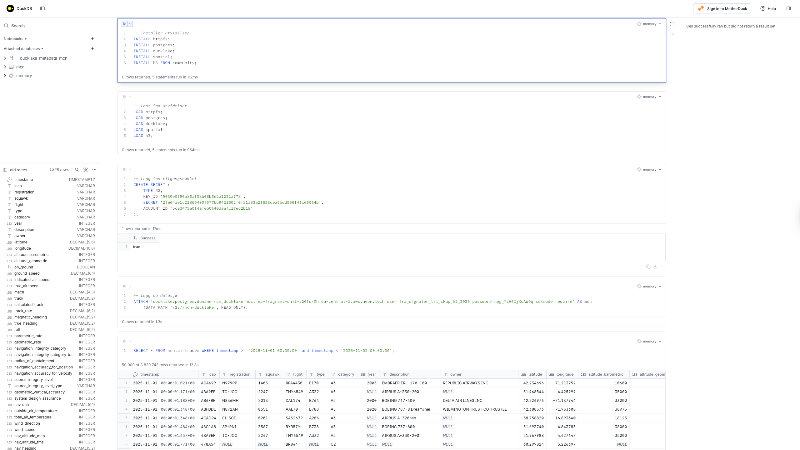 SELECT * FROM mcn.airtraces WHERE timestamp >= '2025-11-01 00:00:00' and timestamp < '2025-11-02 00:00:00';Når du trykker Enter for å kjøre kommandoen, tar det litt tid før du får respons. DuckDB laster ned dataene fra Medieklyngens datasjø, pakker dem ut og importerer dem til databasen. Når det er ferdig, ser det forhåpentligvis først slik ut: