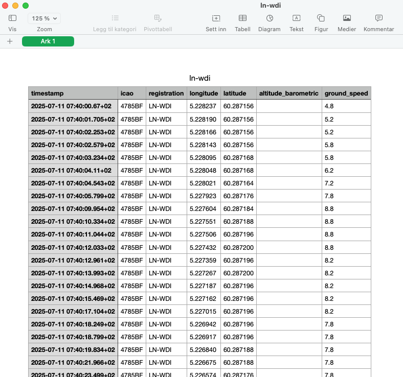 Så hvordan får vi historiske data inn i DuckDB? I disse øvelsene tar vi utgangspunkt i Medieklyngens ADS-B-server, som tilrettelegger dataene i et format som enkelt lar seg importere inn i DuckDB uten ytterligere bearbeiding.