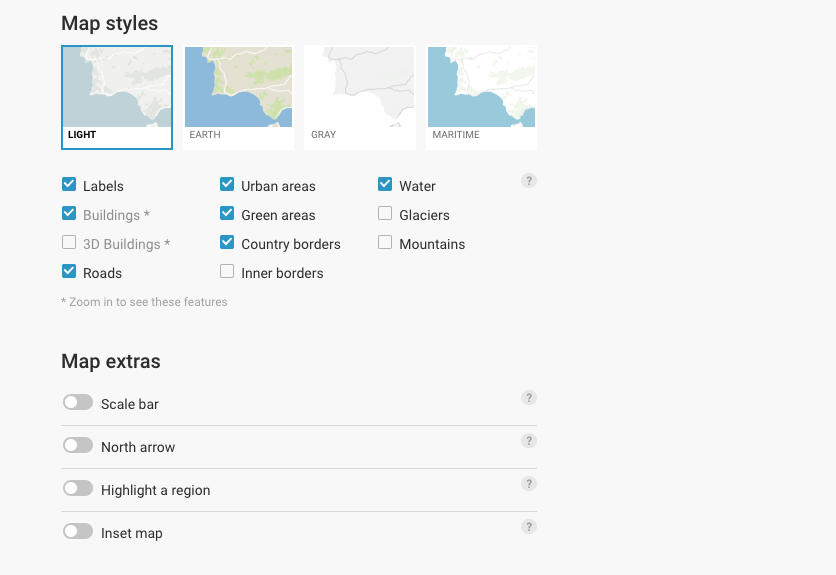I steget Design maps velger du kartdesign og kan aktivere målestokk, utheve en region og mer.