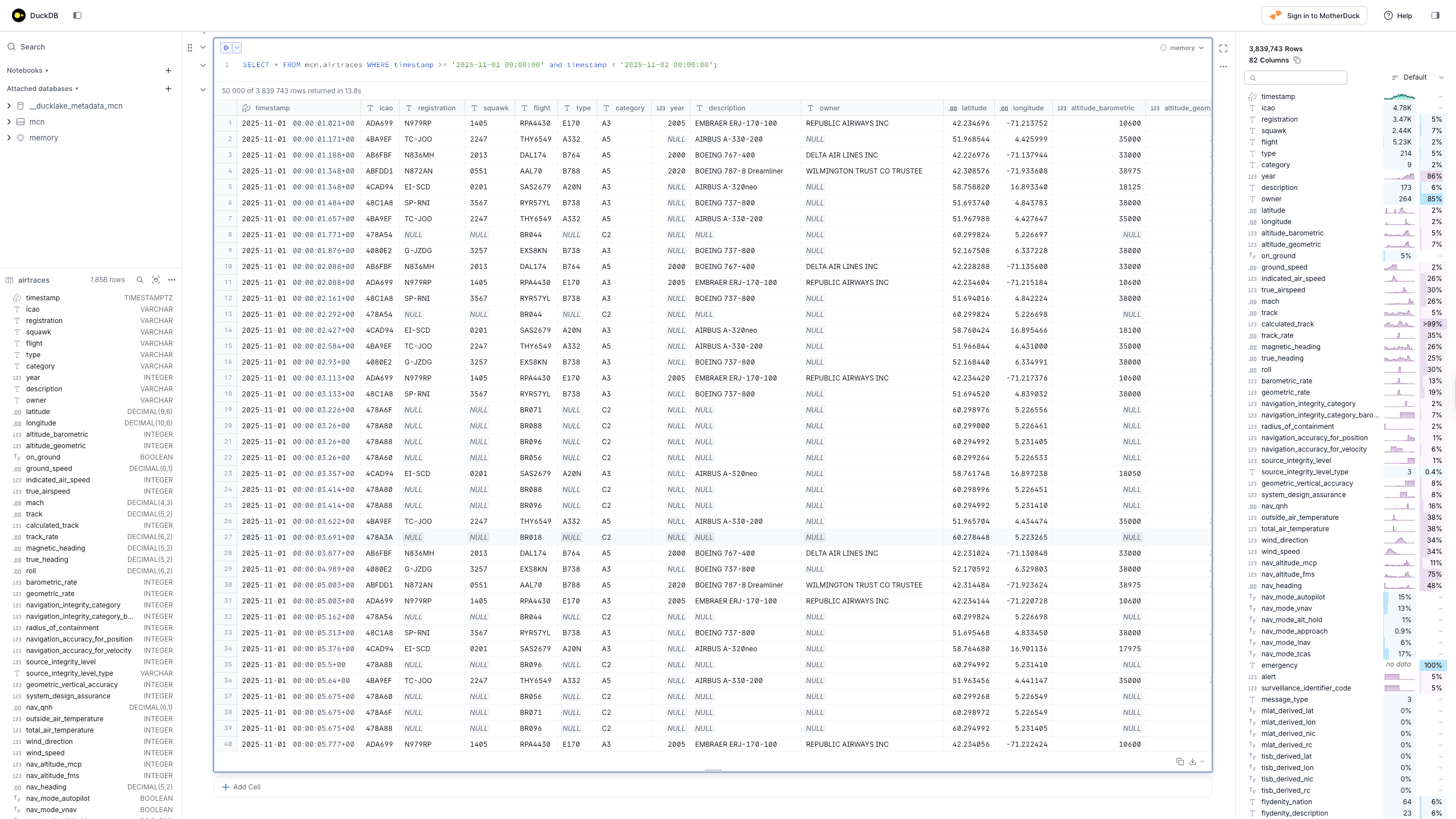 SELECT * FROM mcn.airtraces WHERE timestamp >= '2025-11-01 00:00:00' and timestamp < '2025-11-02 00:00:00';Når du trykker Enter for å kjøre kommandoen, tar det litt tid før du får respons. DuckDB laster ned dataene fra Medieklyngens datasjø, pakker dem ut og importerer dem til databasen. Når det er ferdig, ser det forhåpentligvis først slik ut:
