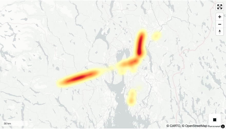 Figur 12: Heatmap av politihelikoptre 11. juli 2025, generert med Lonboard.