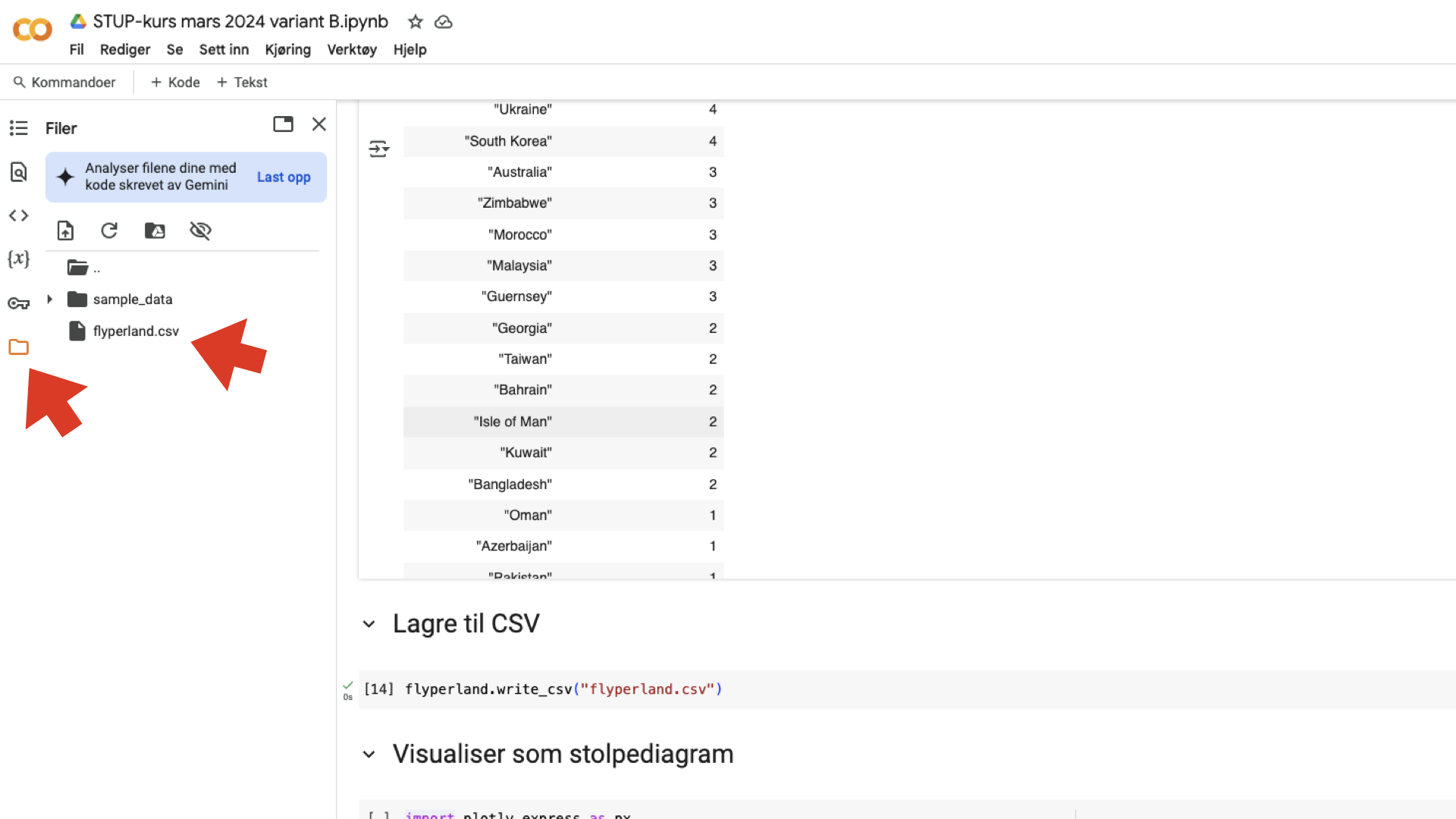 NÃ¥r vi nÃ¥ har brukt litt tid pÃ¥ Ã¥ hente ut og analysere data med DuckDB, er neste steg Ã¥ jobbe visuelt med materialet gjennom visualisering. En god og oversiktlig mÃ¥te Ã¥ gjÞre dette pÃ¥, er Ã¥ jobbe i sÃ¥kalte notebooks â digitale notatbÞker som lar oss dokumentere hele arbeidsprosessen med bÃ¥de tekst og kode. Du kan kjÞre notebooks lokalt, for eksempel med Jupyter Notebook, men for enkelhetens skyld bruker vi Google Colab â en nettbasert lÞsning som sikrer at alle har samme utgangspunkt.