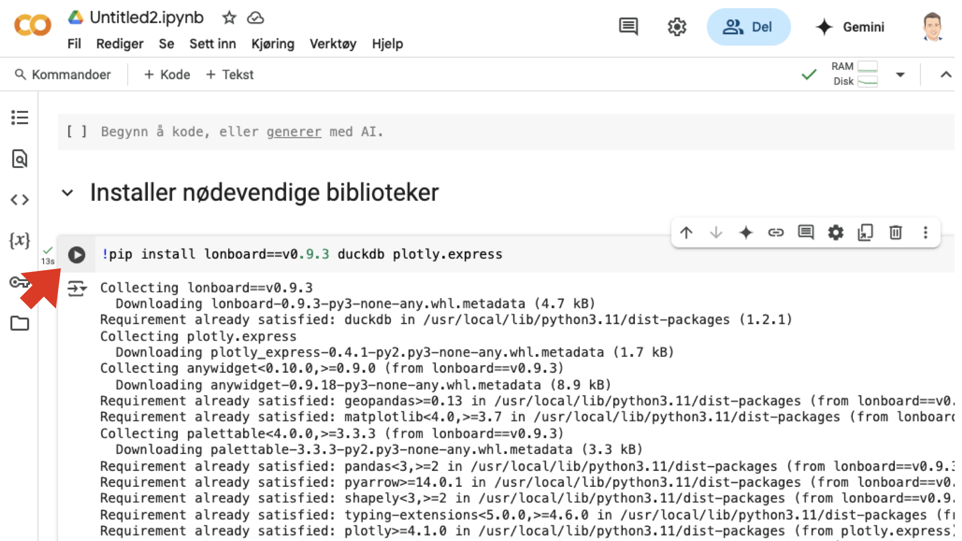 !pip install lonboard==v0.13.0 duckdb==v1.4.2 plotly.expressTrykk på play-ikonet til venstre for cellen for å kjÞre den. Du ser nå at Colab laster ned og installerer verktÞyene.